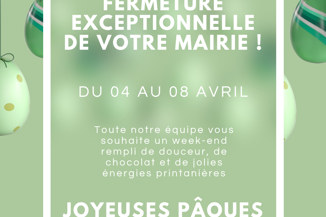 Votre mairie de Busserolles sera exceptionnellement fermée du 4 au 8 avril 2026. Joyeuses pâques !